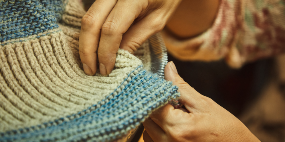 Once all the panels are assembled, it's time for the finishing touches. In Béjar, Rosa and the rest of the artisans use traditional techniques and expert machinery such as a remailleuse to bring the sweater to life.