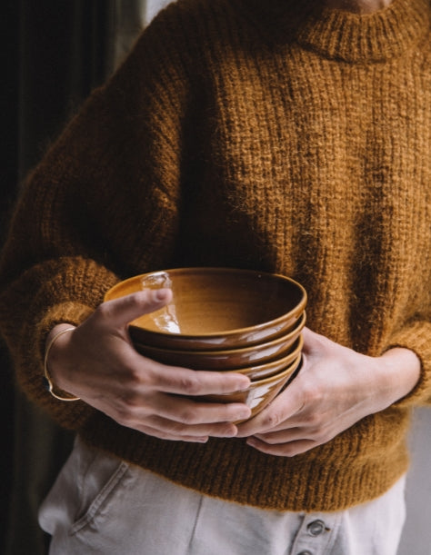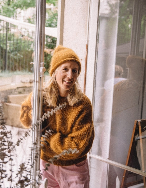 Carefully crafted by the artisans we work with, 25 pieces only will be knitted with the wool that has been dyed and spun exclusively for this project by our colorist and spinner based in Creuse (France), based on an enameled Amber cup of Marion. Our LUCIE sweater is now colored in this warm and bright amber color, and combines to the perfection with the MARION beanie, designed by our favorite potter.
