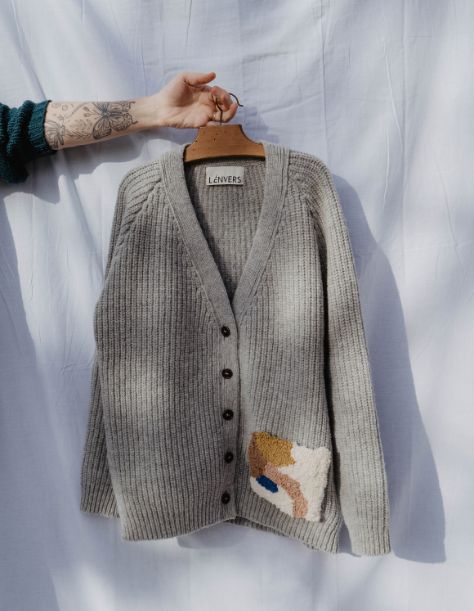 Toutes les poches ont été brodées à la main par Julie Robert en France, et seront appliquées sur nos cardigans dans l'atelier familial avec lequel nous travaillons à Bejar, en Espagne. Nous avons recyclé nos restes de fils de laine mérinos .