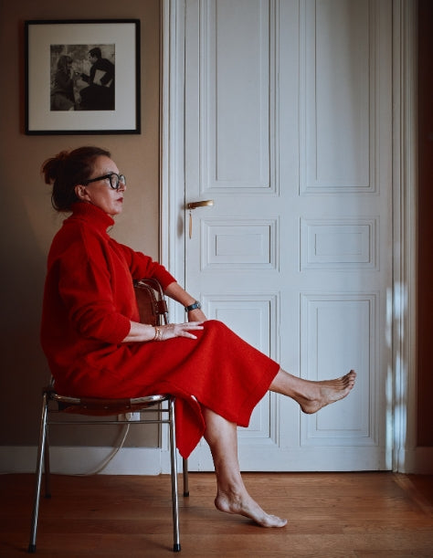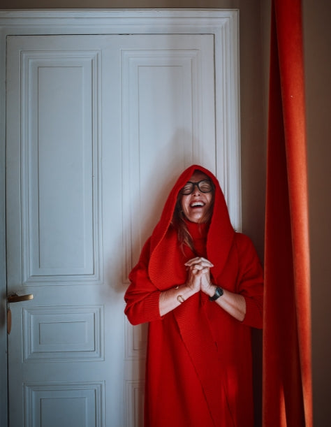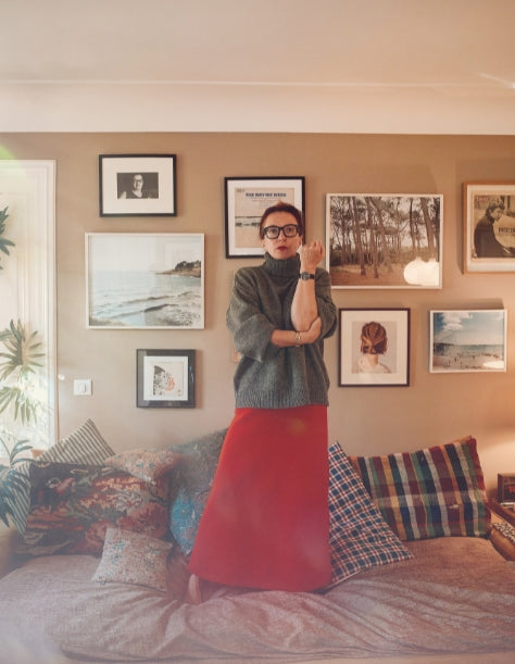 Sa couleur préférée ? Le rouge, effet bonne mine et bonne humeur garanties ! Donc porter notre robe FREYA ou notre jupe AUGUSTINE c'est pour elle presque aussi revigorant que d'aller marcher à Belle-île en Mer où elle adore se réfugier pour partir loin de la capitale et brasser l'océan !