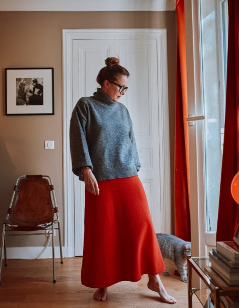 Avant de se lancer dans l'industrie alimentaire et d'ouvrir sa célèbre épicerie sur le boulevard Beaumarchais, Delphine a passé 20 ans dans la mode, travaillant pour des maisons emblématiques telles qu'Agnès B. et Saint Laurent. Elle a un goût irréprochable, un sens aigu du détail et une passion indéniable pour la maille de qualité. Nous étions faites pour nous entendre !
