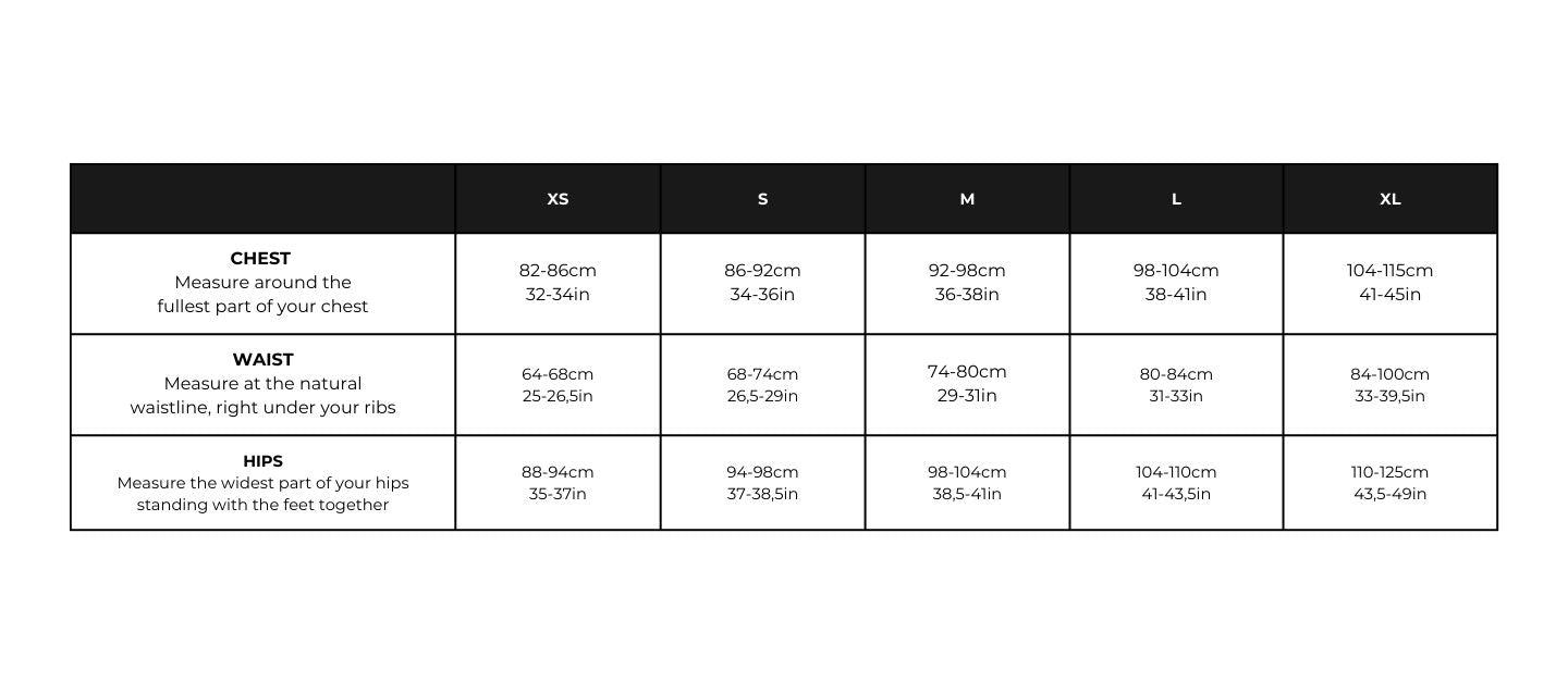 Mesurez votre tour de poitrine, de hanches et de taille et reportez-vous au tableau ci-dessous pour trouver votre taille à L'Envers.