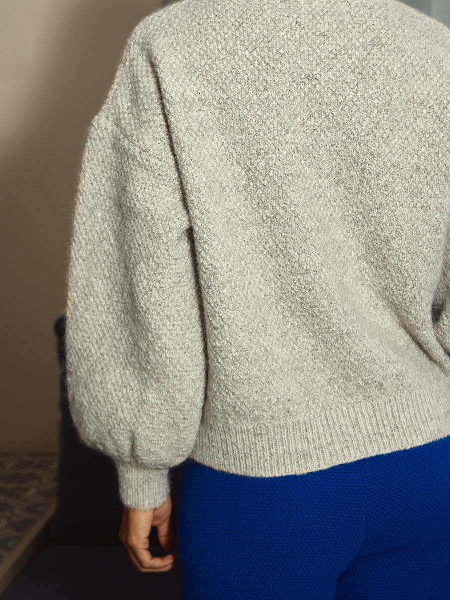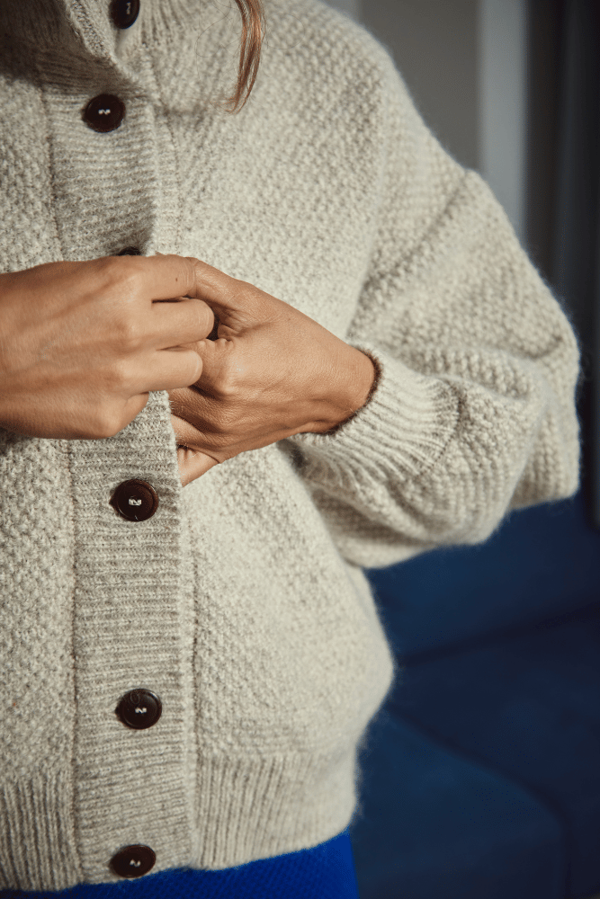 La veste en maille GEORGE en laine a une coupe oversize, nous recommandons donc de commander votre taille habituelle pour obtenir l'effet oversize. Si vous la préférez un peu plus près du corps, commandez une taille en dessous, sachant que les tricots se desserrent généralement légèrement une fois portés. La tolérance pour la taille indiquée sur le guide des tailles peut être de +/-2cm ou +/-1in.