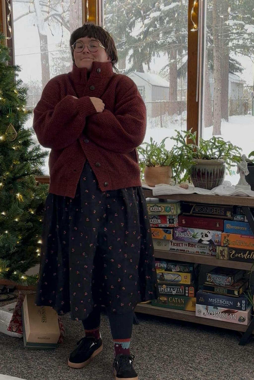 La veste en maille GEORGE en laine a une coupe oversize, nous recommandons donc de commander votre taille habituelle pour obtenir l'effet oversize. Si vous la préférez un peu plus près du corps, commandez une taille en dessous, sachant que les tricots se desserrent généralement légèrement une fois portés. La tolérance pour la taille indiquée sur le guide des tailles peut être de +/-2cm ou +/-1in.