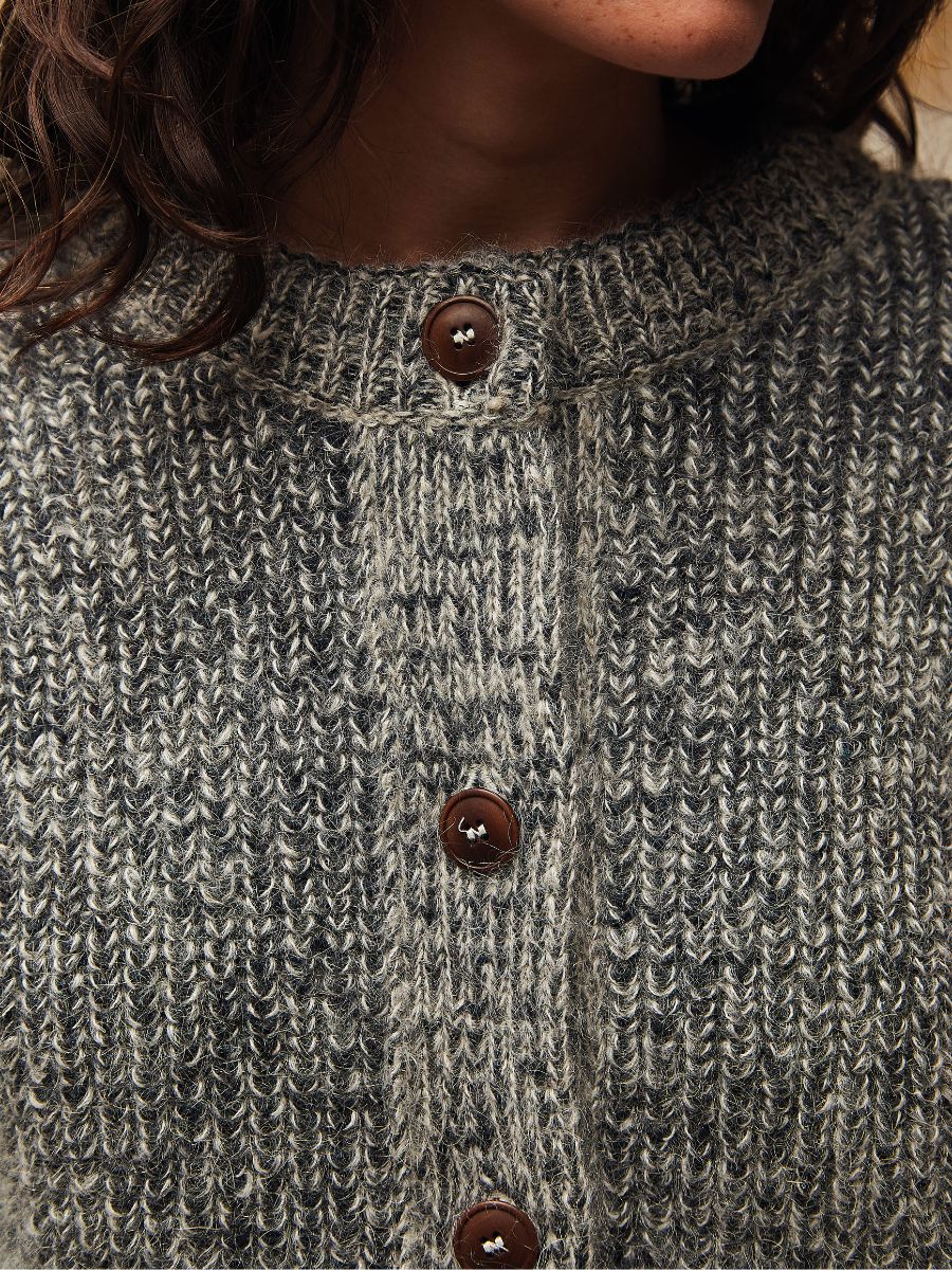 The CHARLOTTE Round-neck Cardigan in wool has a fitted shape, so we recommend ordering your usual size. If you like it more oversize, take a size bigger knowing that knits usually loosen slightly once worn. The tolerance for the size indicated on the size guide can be +/-2cm or +/-1in.