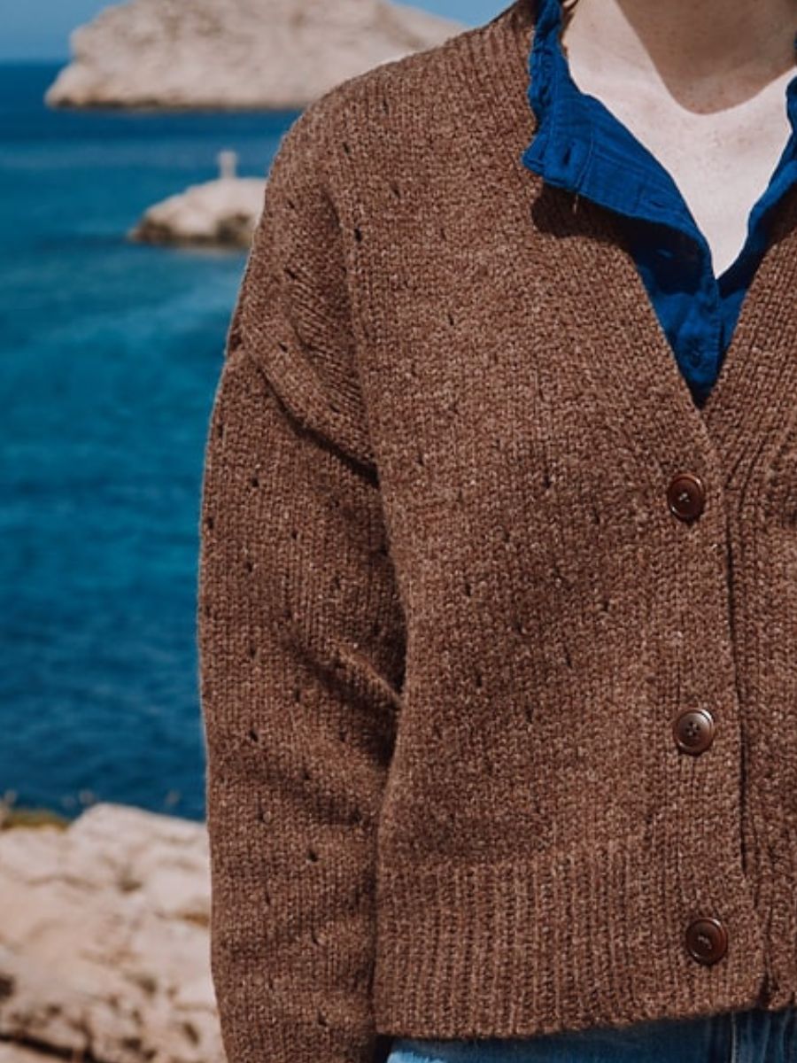 The KATRINA Open Weave Cardigan in 100% merino wool has a regular fit, so we recommend ordering your usual size. If you like it more oversized, order a size up knowing that knits usually loosen slightly once worn. The tolerance for the size indicated on the size guide can be +/-2cm or +/-1in.