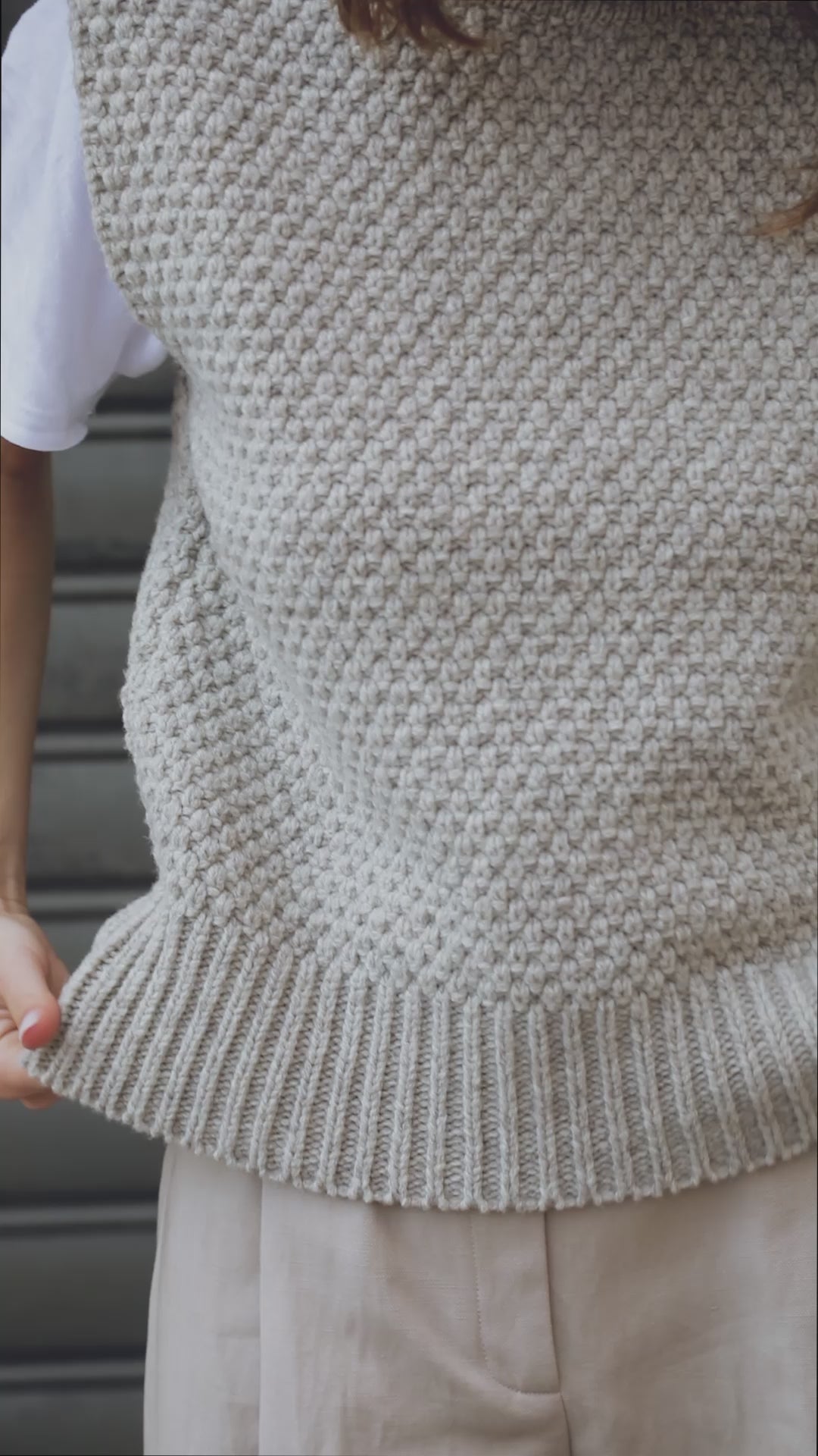 The MAIA Sleeveless Sweater in 100% merino wool has a fitted shape, so we recommend ordering your usual size. If you like it more oversized, order a size up knowing that knits usually loosen slightly once worn. The tolerance for the size indicated on the size guide can be +/-2cm or +/-1in.
