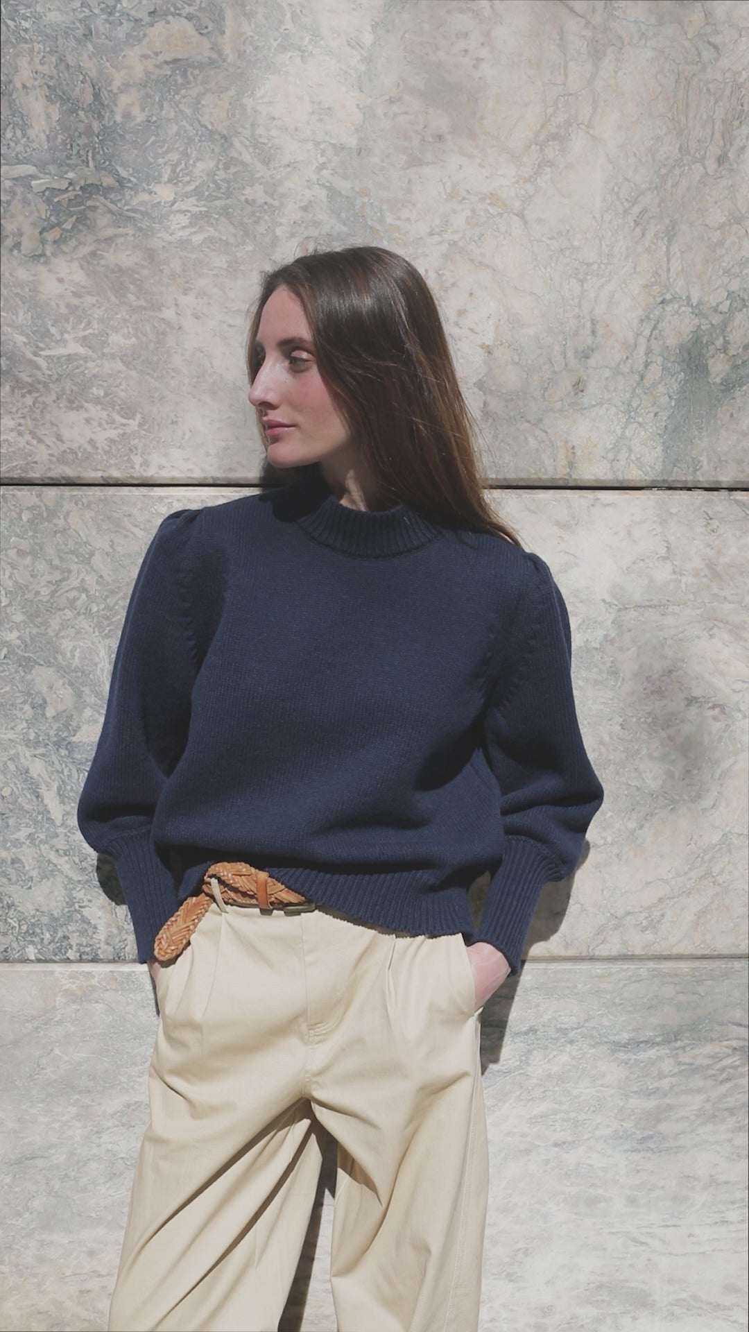 NATHALIE Puff Sleeve Sweater in Merino Wool - Navy